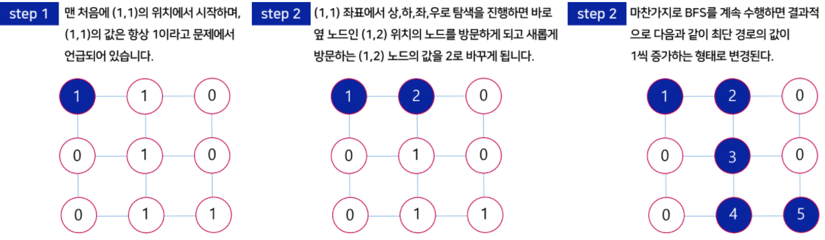 현재 위치는 (1, 1)이고 미로의 출구는 (N,M)의 위치에 존재하며 한 번에 한 칸씩 이동할 수 있다.