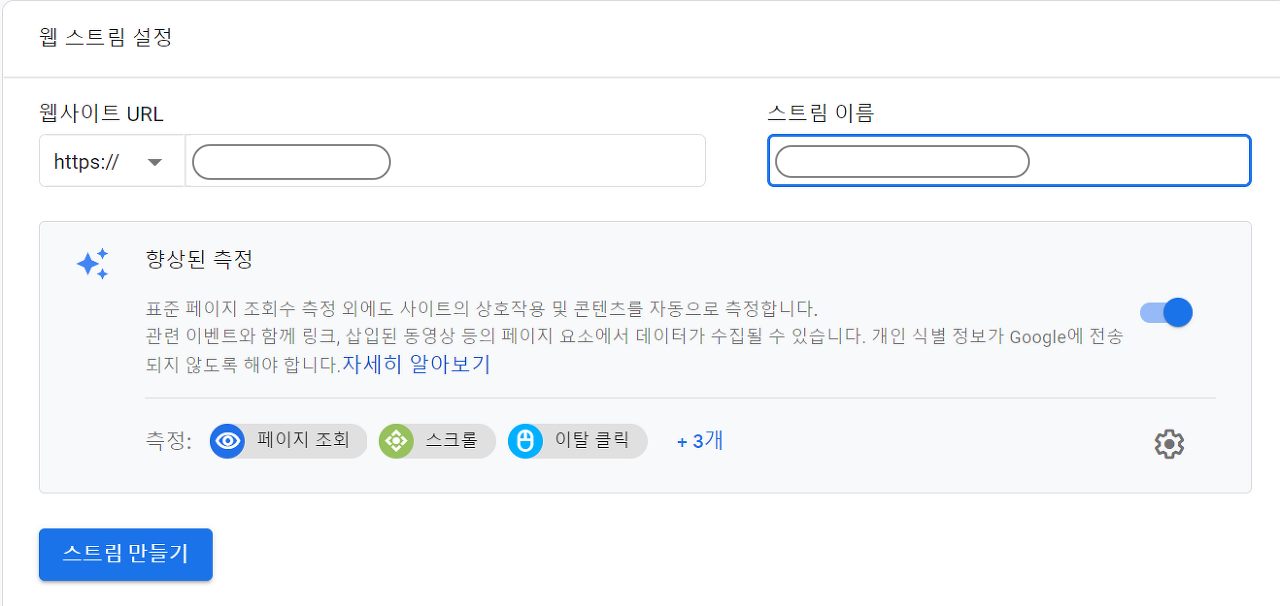 웹으로 설정했을 경우, 웹사이트의 주소와 사용할 이름을 적고 만들기를 누른다.
