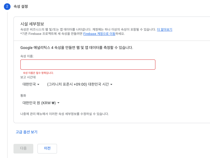 속성 이름(본인의 웹사이트)를 입력한 뒤, 보고 시간대 및 보고서에 사용할 통화를 선택한다.