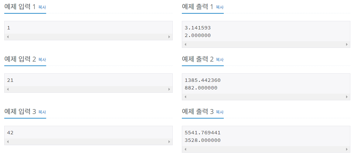 첫째 줄에는 유클리드 기하학에서 반지름이 R인 원의 넓이를, 둘째 줄에는 택시 기하학에서 반지름이 R인 원의 넓이를 출력한다. 정답과의 오차는 0.0001까지 허용한다.