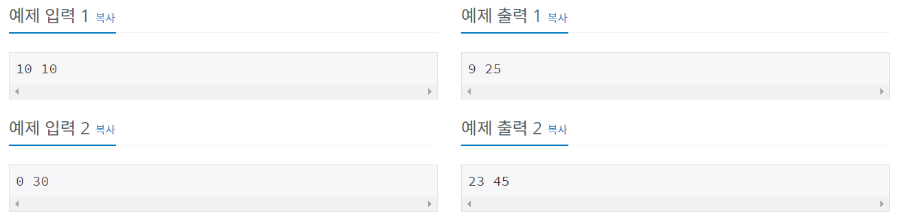 현재 상근이가 설정한 알람 시각이 주어졌을 때, 창영이의 방법을 사용한다면, 이를 언제로 고쳐야 하는지 구하는 프로그램을 작성하시오.