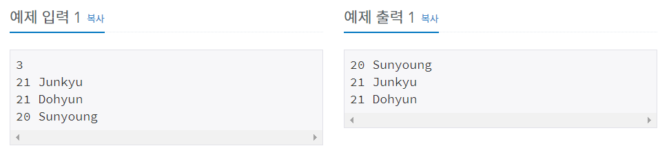온라인 저지에 가입한 사람들의 나이와 이름이 가입한 순서대로 주어진다.
