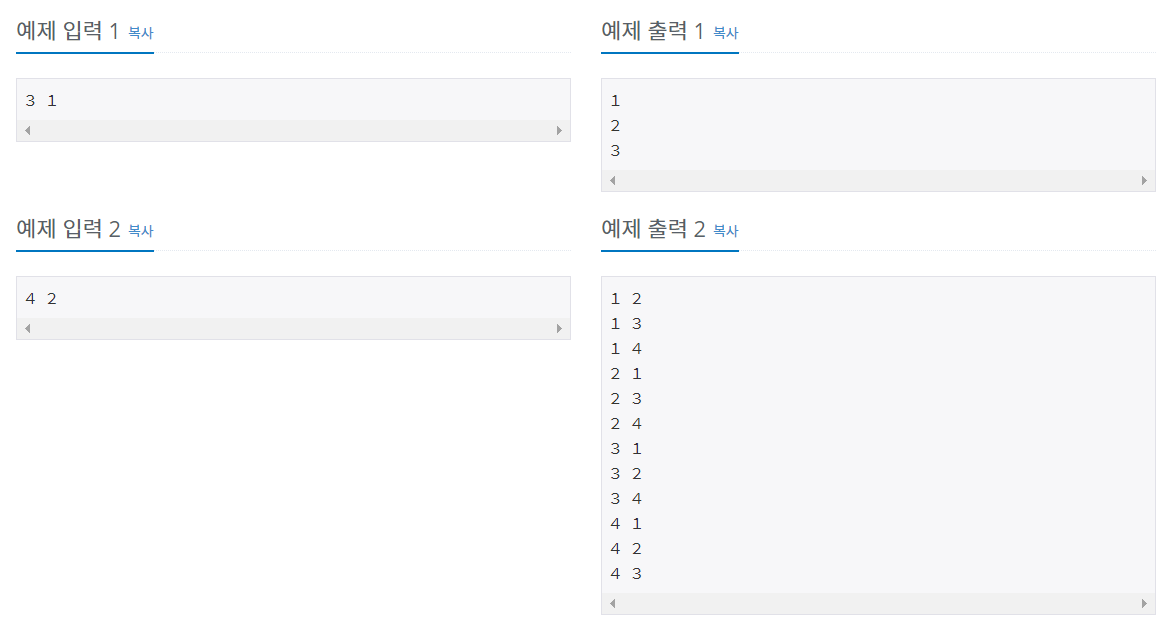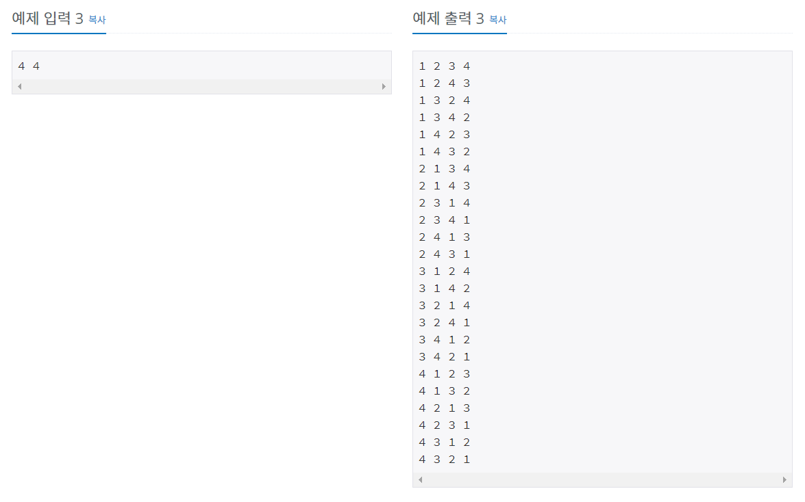 첫째 줄에 자연수 N과 M이 주어진다. (1 ≤ M ≤ N ≤ 8)