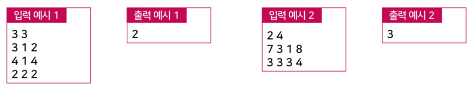 - 첫째 줄에 숫자 카드들이 놓인 행의 개수 N과 열의 개수 M이 공백을 기준으로 하여 각각 자연수로 주어진다