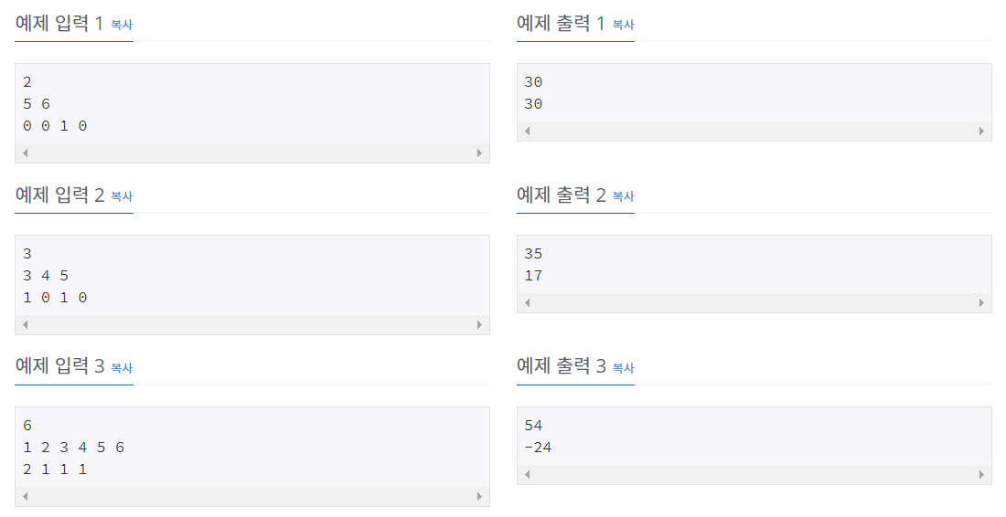 (1 ≤ Ai ≤ 100) 셋째 줄에는 합이 N-1인 4개의 정수가 주어지는데, 차례대로 덧셈(+)의 개수, 뺄셈(-)의 개수, 곱셈(×)의 개수, 나눗셈(÷)의 개수이다.