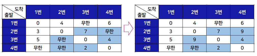 Step 4 4번 노드를 거쳐 가는 경우를 고려하여 테이블을 갱신한다
