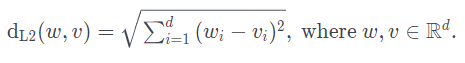 - 유클리디언 거리 = L2 거리 : N차원 공간에서 두 점 사이의 최단 거리를 구하는 접근법