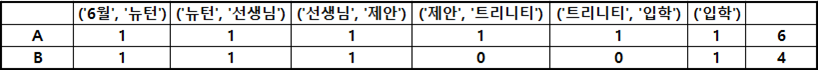 그림은 문장 A와 B의 단어 문서 행렬을 표현한 표이다. 행렬의 열은 문장 A의 2-gram 토큰값이며, 행은 문장 A와 B로 구성되어 있다.