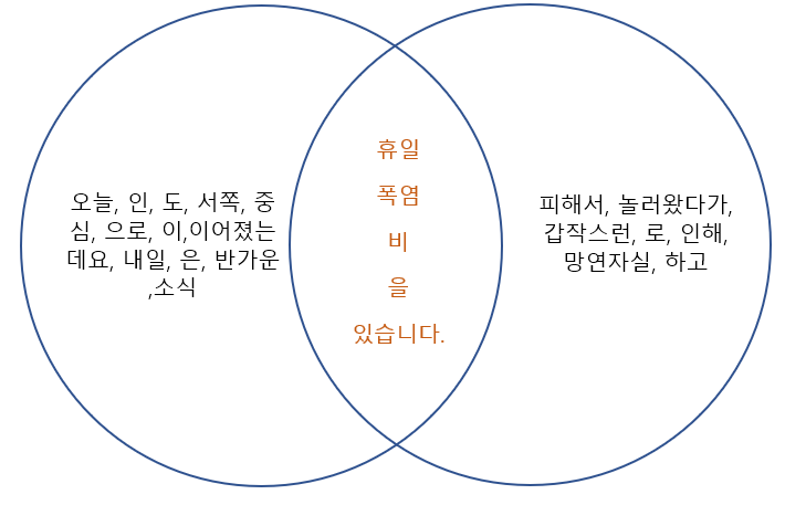 B = {폭염, 을, 피해서, 휴일, 에, 놀러왔다가, 갑작스런, 비, 로, 인해, 망연자실, 하고, 있습니다.}