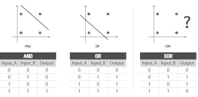 아래 그림에서 확인할 수 있듯이 기존의 퍼셉트론은 AND와 OR문제는 해결할 수 있었지만 선형 분류기라는 한계에 의해 XOR과 같은 non-linear한 문제는 해결할 수 없었다.