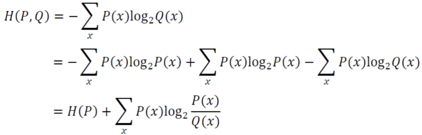 여기에 딥러닝 학습을 수행하는데 있어 딥러닝 모델의 추정 확률분포 Q, 그리고 딥러닝 모델이 추구해야 할 미지의 확률분포 P가 있다. 이 P와 Q를 활용하여 교차 엔트로피를 계산하며, 이 교차 엔트로피가 낮아지는 쪽으로 모델의 추정 확률분포 Q를 꾸준히 개선함으로 확률분포 Q를 확률 분포 P에 가깝게 접근시켜 갈 수 있다.