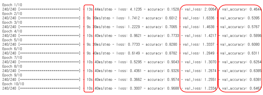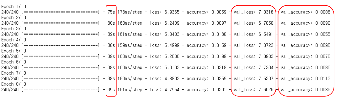 수치를 확인해 보면 학습에 대한 성능 향상이 원활하게 되지 않고 있다는 것을 알 수 있다.