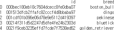 id 컬럼에 있는 값은 각 사진 파일의 이름이다. breed 컬럼에는 각 사진이 어느 견종인지 분류돼 있다.