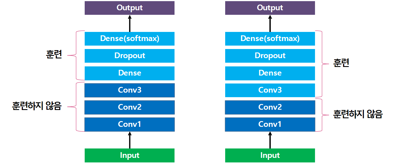 미리 훈련된 컨볼루션 신경망을 불러올 때 가장 마지막의 Dense 레이어를 제외해야 한다. 이미지를 분류하는 컨볼루션 신경망에서 이 Dense 레이어는 소프트맥스 활성화 함수로 실제 분류 작업을 수행하는 레이어이다. 만약 ImageNet 데이터로 학습했다면 이 레이어의 뉴런 수는 ImageNet 문제의 이미지 분류 숫자와 같은 1,000일 것이다.