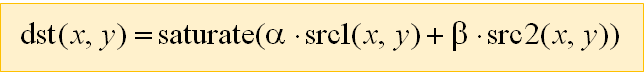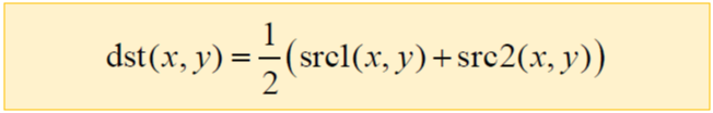 - 두 영상의 같은 위치에 존재하는 픽셀 값에 대하여 가중합을 계산하여 결과 영상의 픽셀 값으로 설정