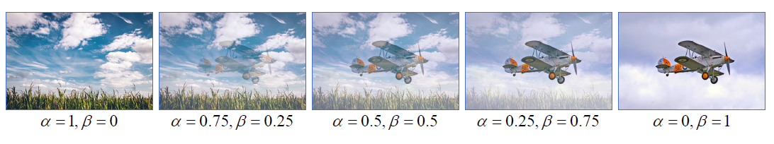 - 보통 𝛼 + 𝛽 = 1 이 되도록 설정 → 두 입력 영상의 평균 밝기를 유지