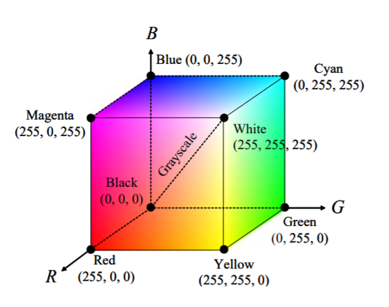 - 빛의 삼원색인 빨간색(R), 녹색(G), 파란색(B)을 혼합하여 색상을 표현 (가산 혼합)
