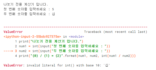 num2에 숫자값을 넣어줘야 하는데 문자를 넣어줘서 ValueError가 발생했다.