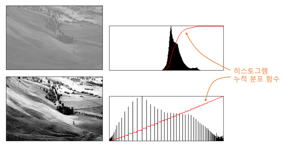 - 히스토그램 균등화, 균일화, 평탄화라고 한다.