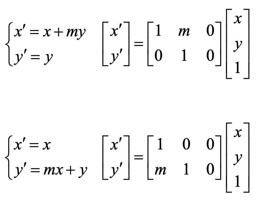 이동 변환에서는 단위 행렬을 어파인 행렬로 생성했지만, 전단 변환은 m 상수도 필요하다.