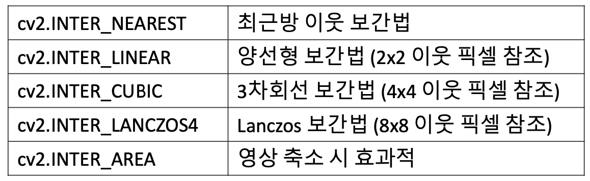 - interpolation: 보간법 지정. 기본값은 cv2.INTER_LINEAR