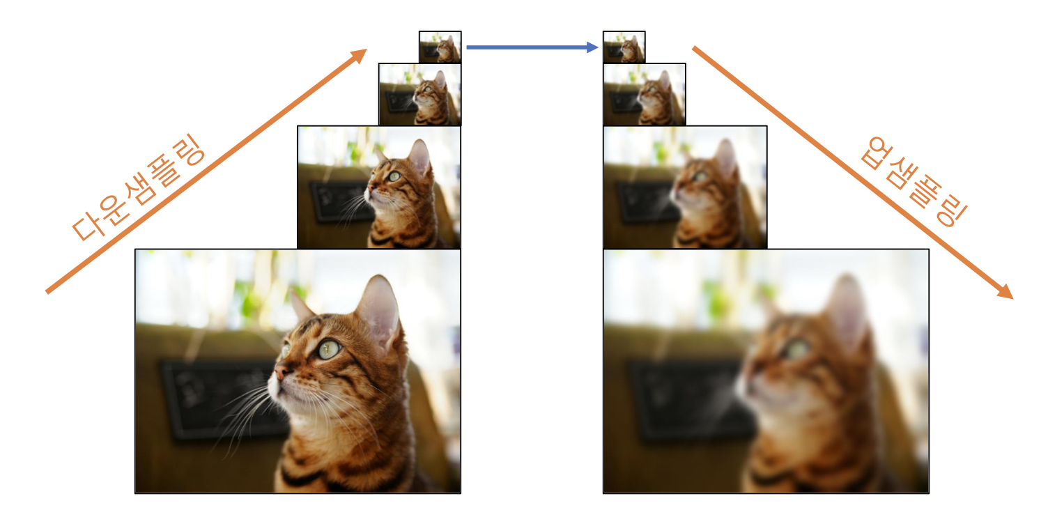 보통가우시안 블러링 & 다운 샘플링 형태로 축소하여 구성한다.
