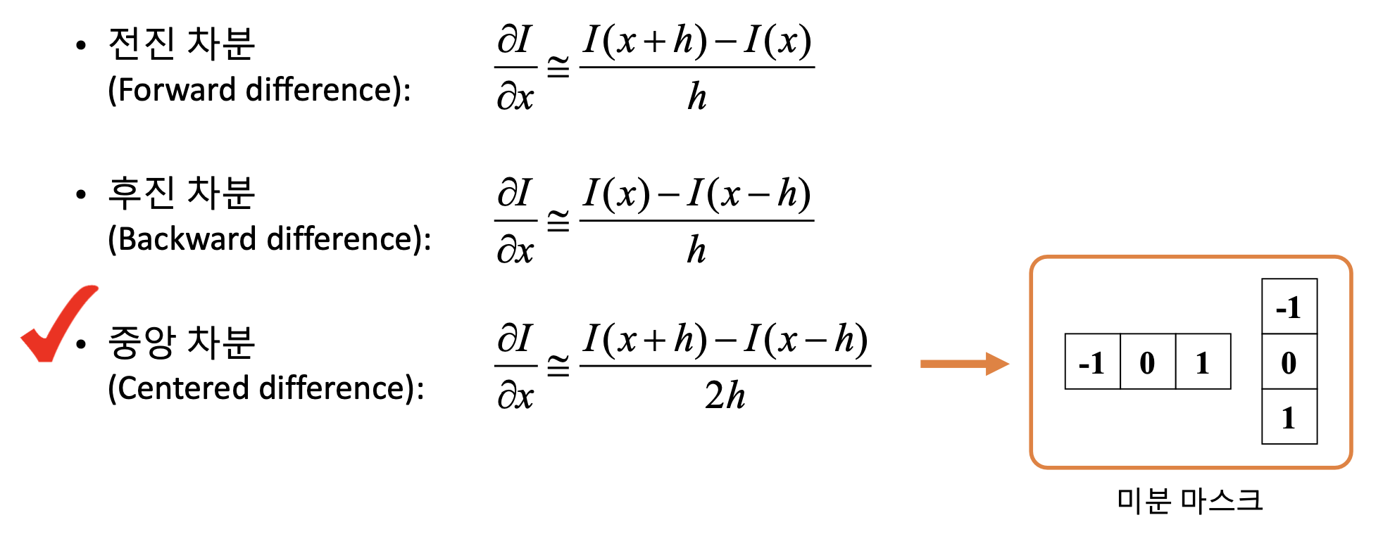 중앙차분을 마스크로 만들어 필터를 적용하면 영상의 미분 값을 구할 수 있다.