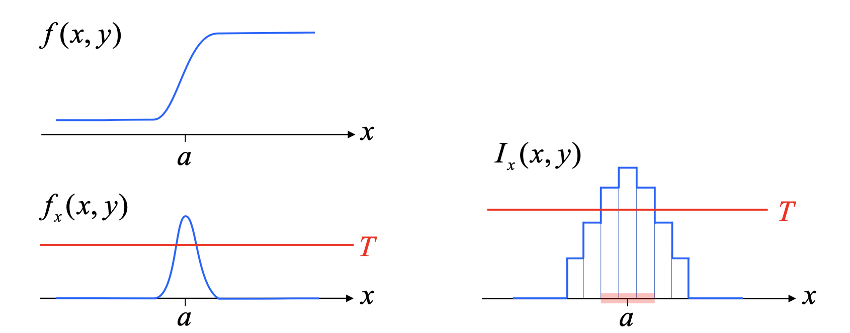 검출한 미분값에 T 임계값을 설정해주는 것이 중요하다. 임계값보다 높으면 에지로 판단하게 된다.