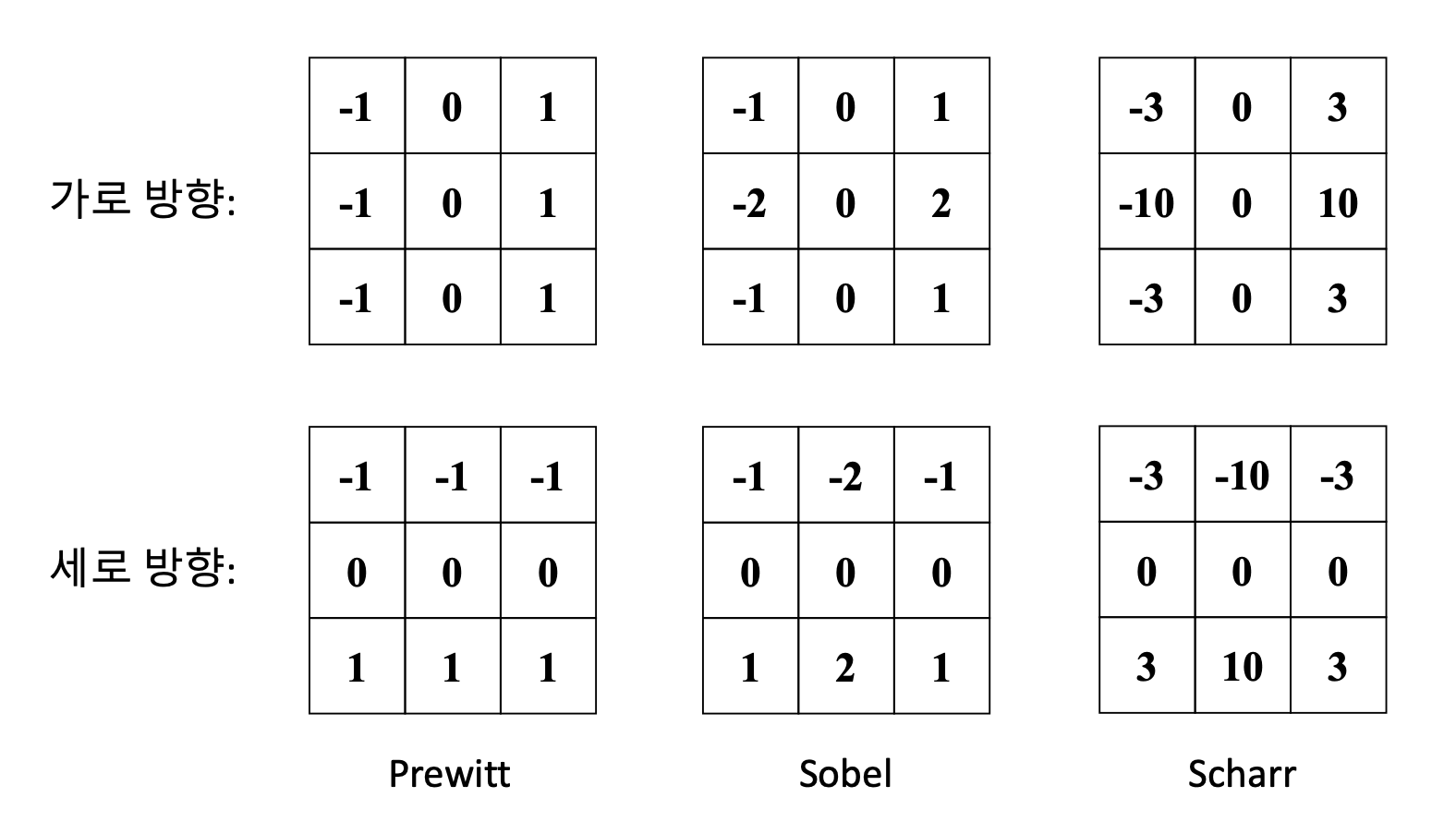 하지만 평균값 필터보다는 가우시안 블러의 효과가 더 좋듯이 소벨필터는 3X3 마스크에 가중치를 적용한다.