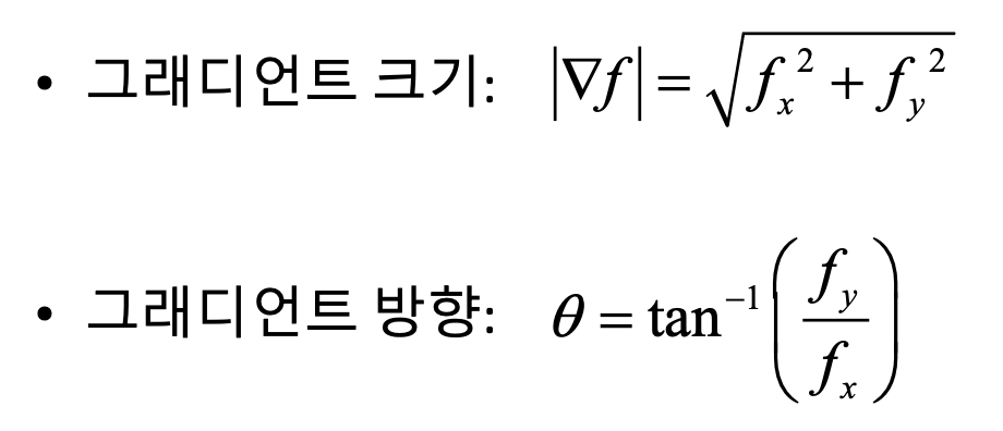 그래디언트 크기는 픽셀 값의 차이, 변화량을 의미하며, 그래디언트 방향은 픽셀 값이 가장 급격하게 증가하는 방향을 나타낸다.