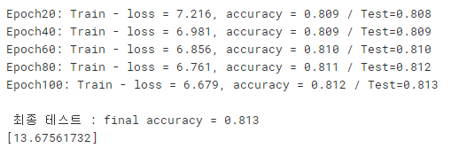 f"Epoch{epoch + 1}: Train - loss = {np.mean(losses):5.3f}, accuracy = {np.mean(accs):5.3f} / Test={acc:5.3f}"