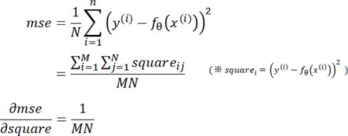 결국 $ \frac{\partial mse}{\partial square}$ 를 수행하면 $ \frac{1}{ MN}$ 이 된다.