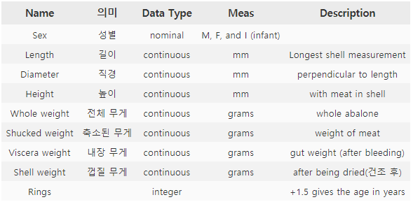 데이터 셋은 Kaggle에 있는 Abalone Dataset 에서 받아서 사용 할 수 있다.