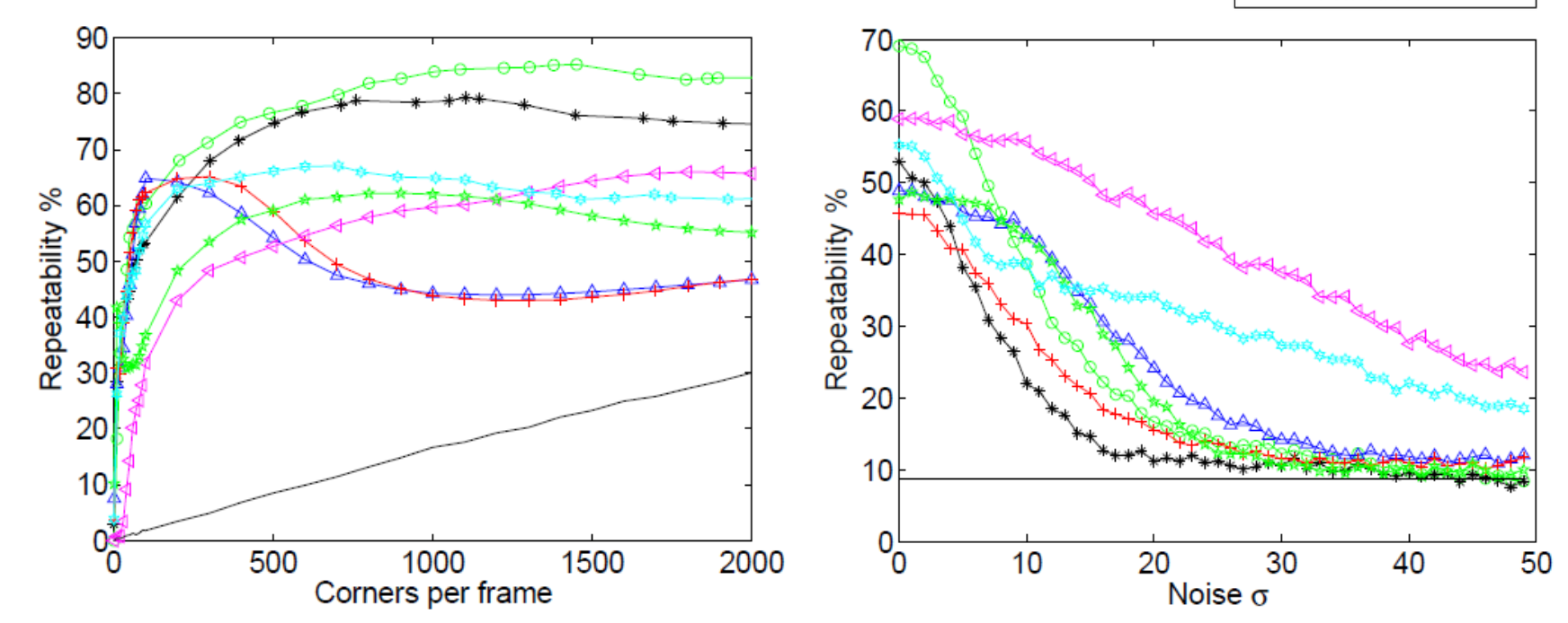 FAST 방법의 반복 검출률이 대체로 높습지만, 노이즈에 민감하다.