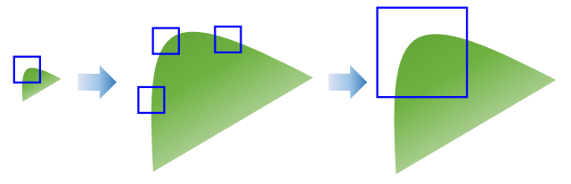 확대된 영상에서 작은 사각형으로 코너를 찾으려하면 기존의 코너가 에지처럼 보이게 되며, 이 경우에 다양한 크기 관점에서 특징점을 검출하는 것이 필요하다.