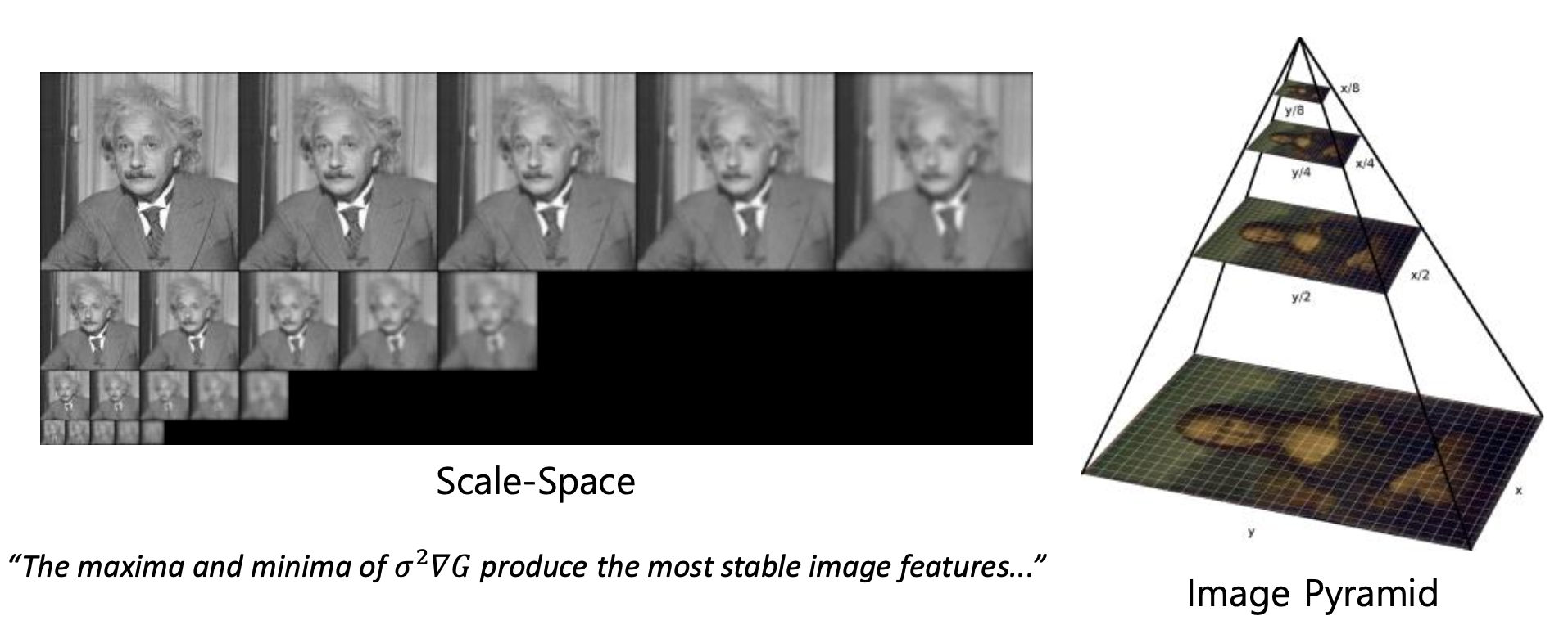 SIFT, KAZE, AKAZE, ORB 등 다양한 특징점 검출 방법에서 스케일 스페이스(scale-space), 이미지 피라미드(image pyramid)를 구성하여 크기 불변 특징점을 검출한다.