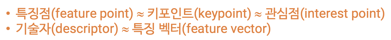 고유한 특징을 나타내는 점들을 집합한 것을 특징점(feature point) or 키포인트(keypoint) or 관심점(interest point) 라고 한다.