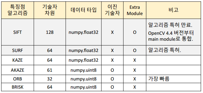 OpenCV 주요 특징점 알고리즘과 기술자 특성