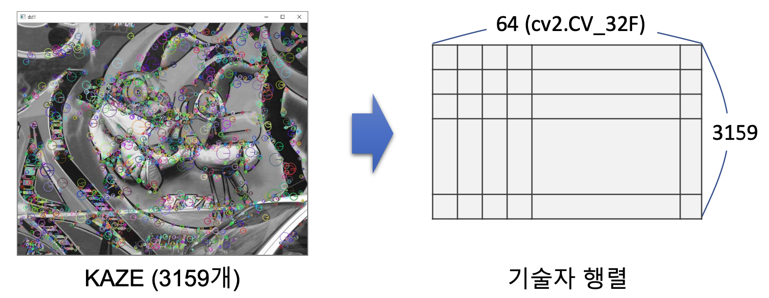 행 개수는 특징점 개수, 열 개수는 특징점 기술자 알고리즘에 의해 다르게 정의된다.