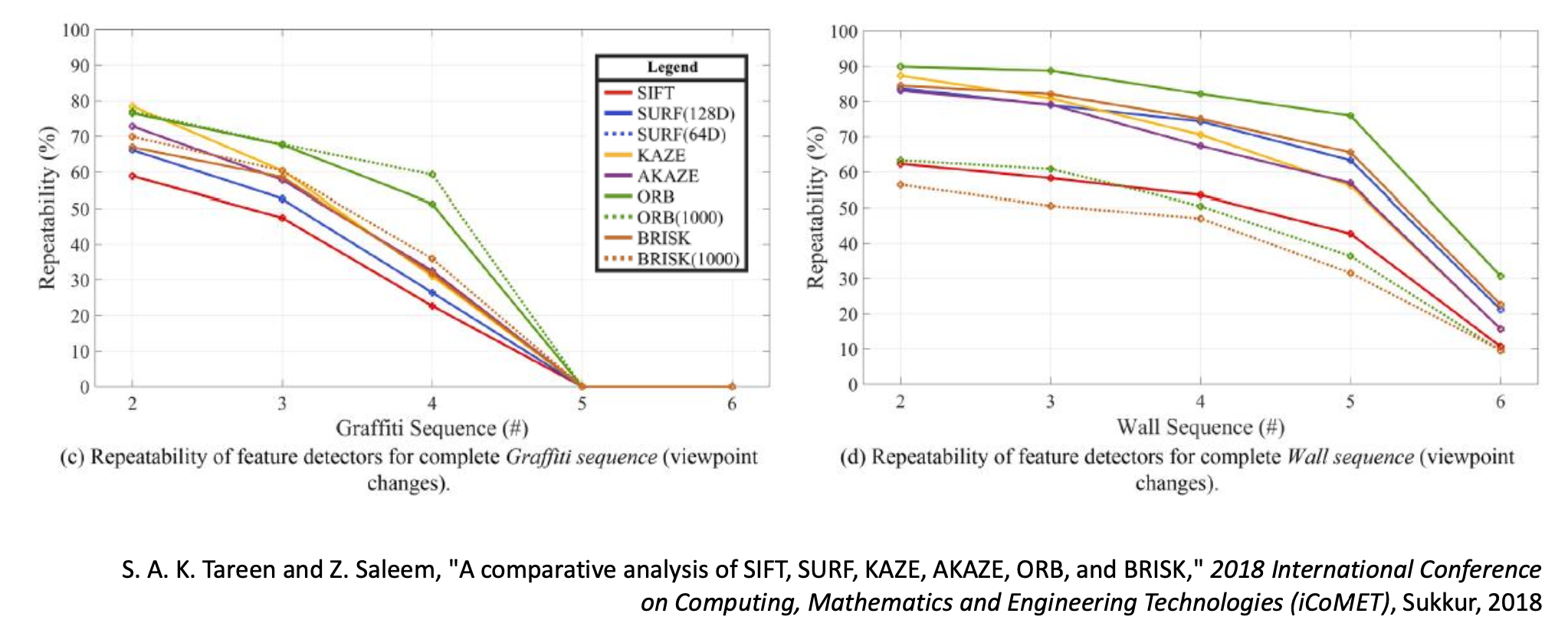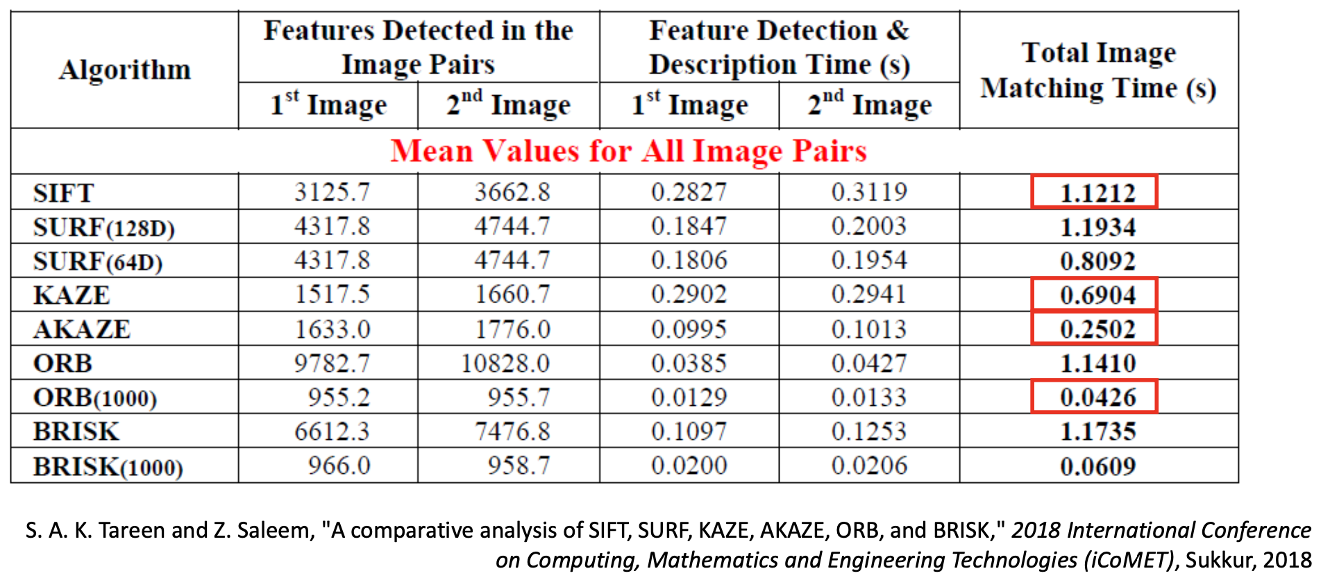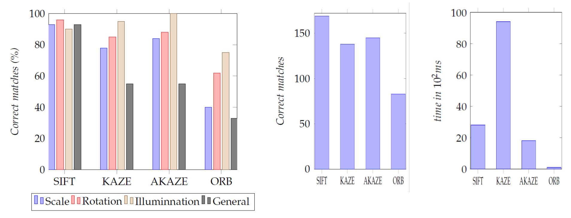 ORB는 매칭 퀄리티, 검출 결과가 안좋지만 속도가 빨라 자주 이용되며, 매칭하는 성능에 있어서는 AKAZE가 더 좋다.