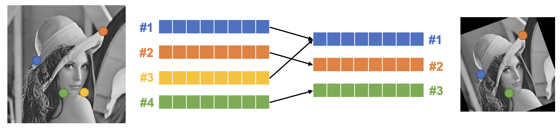 왼쪽은 4개의 기술자, 오른쪽은 3개의 기술자를 계산했으며, 가장 비슷한 것을 찾으므로 4개의 점은 다 매칭이 된다.