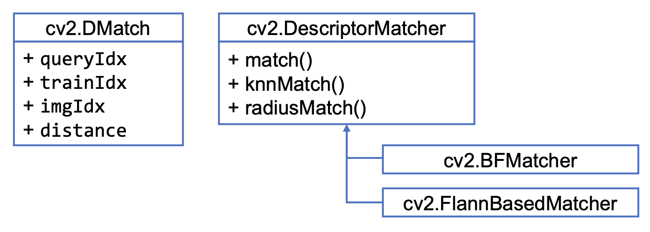 실제로 사용할 때는 match, knnMatch, radiusMatch를 상속받은 cv2.BFMatcher or cv2.FlannBasedMatcher를 이용해야 한다.