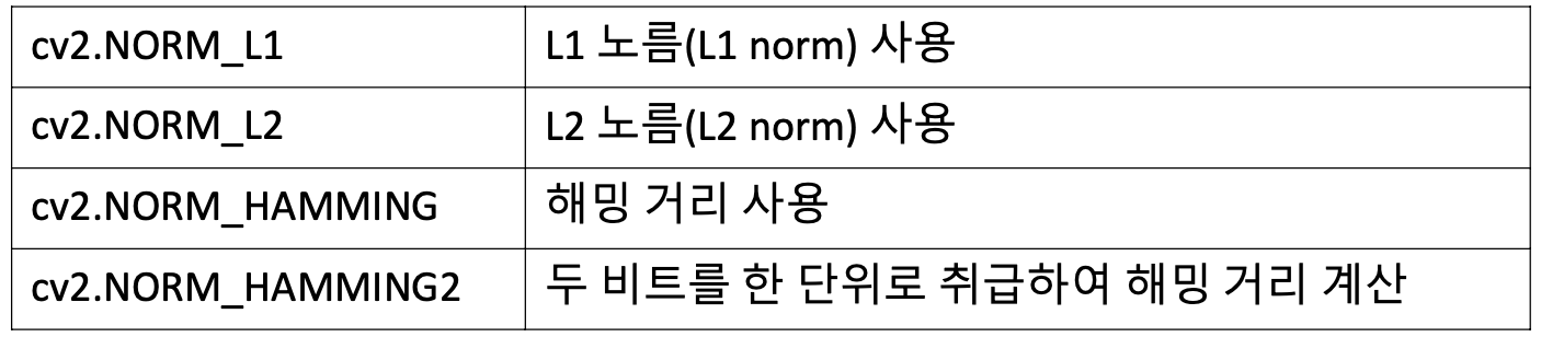 - normType: 특징점 기술자 거리 계산 방식 지정. 기본값은 cv2.NORM_L2.