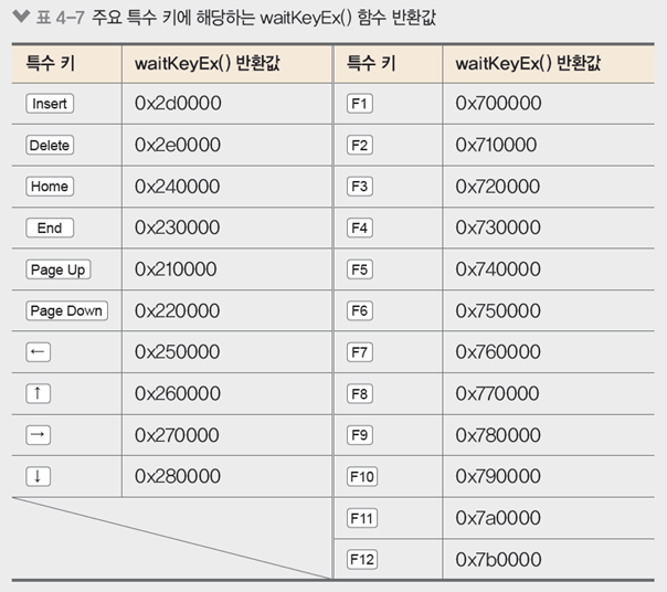 Windows 운영체제에서 방향키, 함수키 등의 특수키 입력은 cv2.waitKeyEx() 함수를 사용한다.