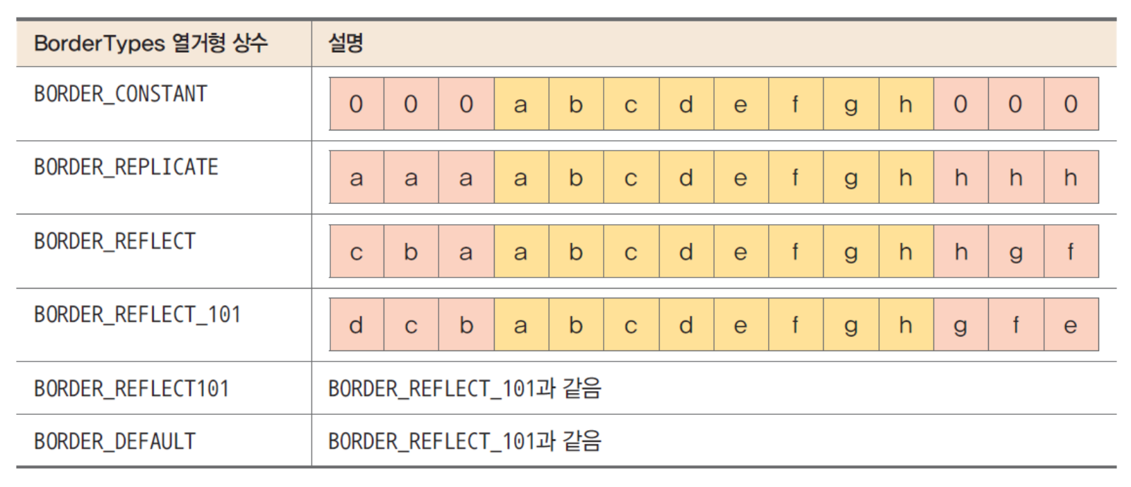 OpenCV 필터링에서 지원하는 가장자리 픽셀 확장 방법은 아래와 같다.