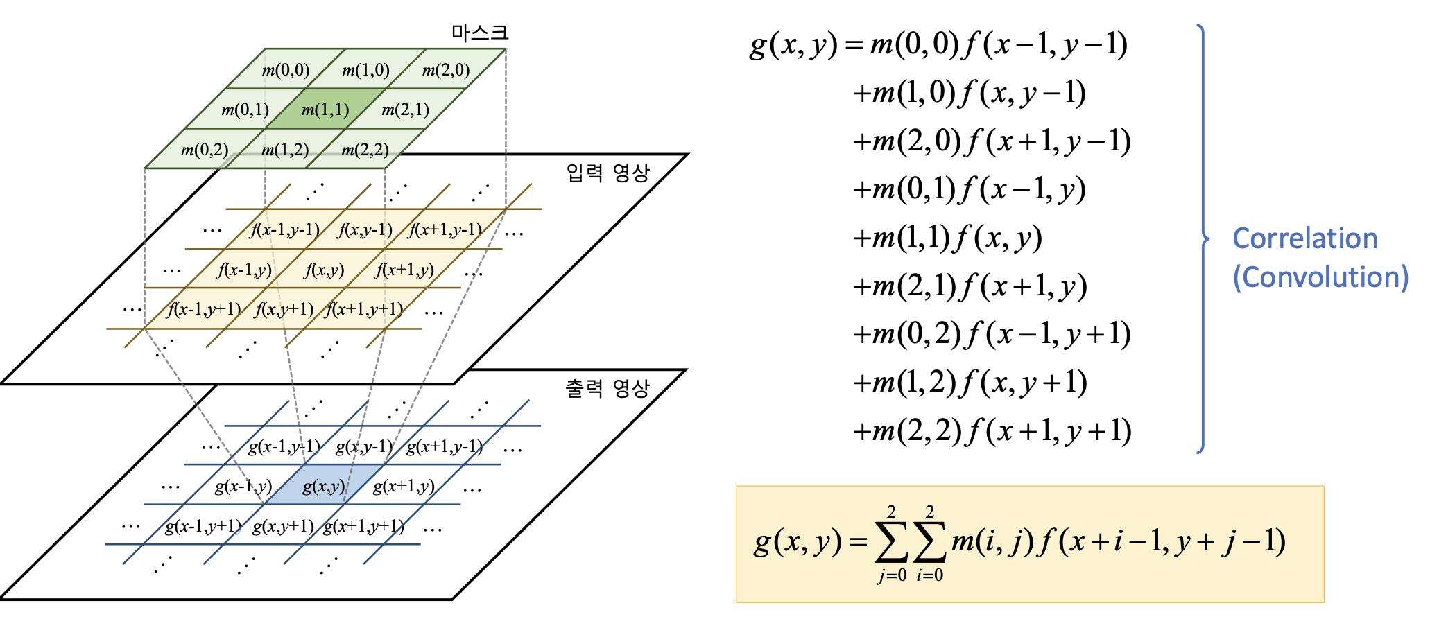 주로 마스크연산을 이용한다. (마스크 = 커널(kernel) = 윈도우(window) = 템플릿(template))