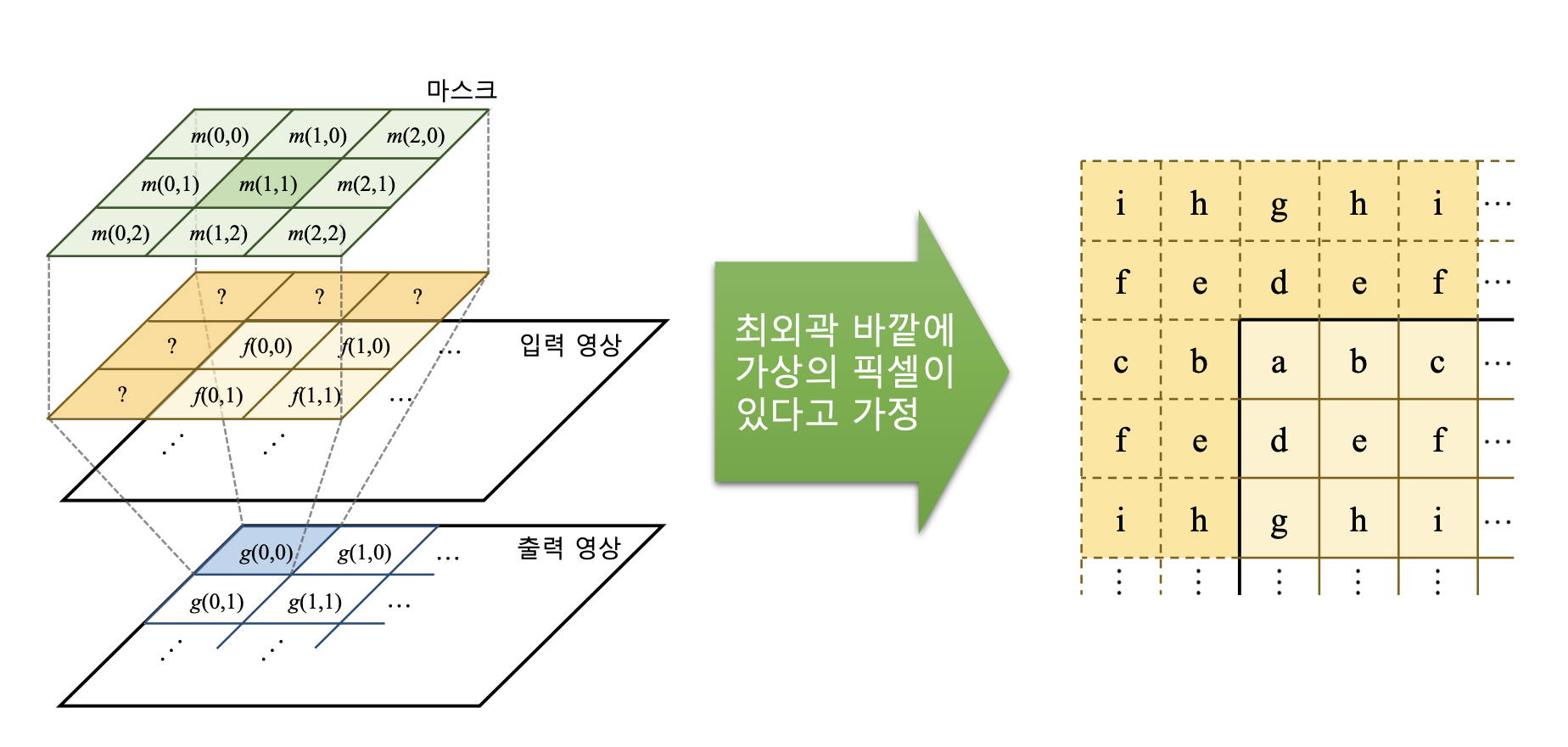 가장자리 픽셀은 주변 픽셀이 없기 때문에 필터링을 하기가 어렵다. 따라서 최외곽 바깥에 가상의 픽셀이 있다고 가정하여 필터링을 진행한다.