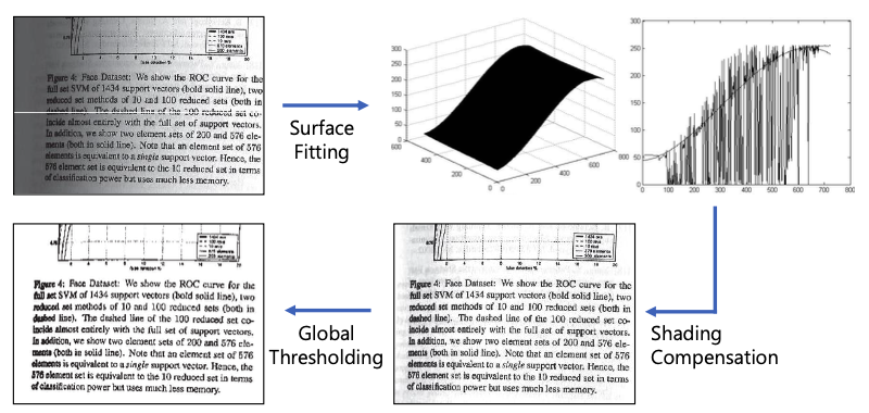 - 불균일한 조명 성분 보상 후 이진화 수행