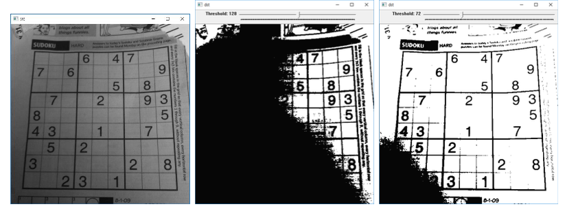 - 픽셀 주변에 윈도우 설정하여 지역 이진화 수행