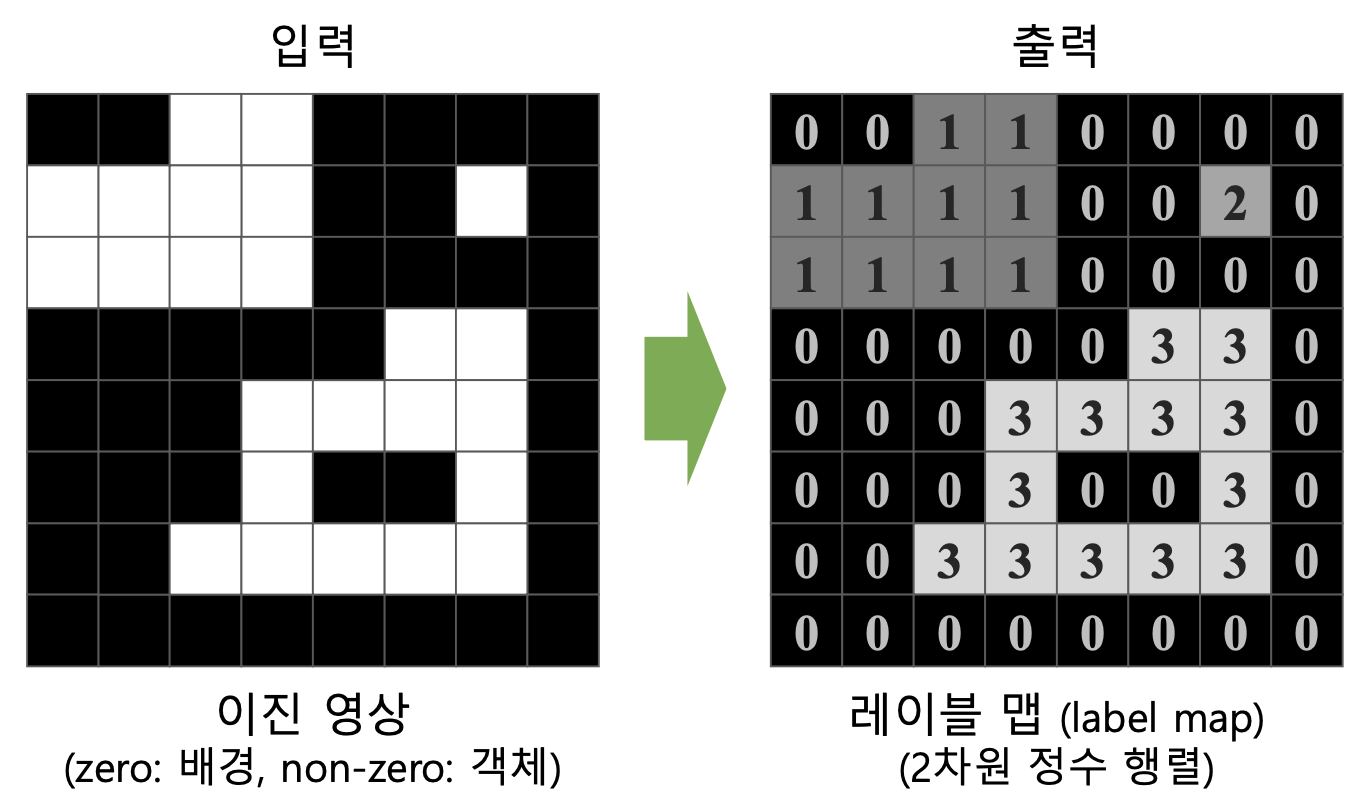 서로 연결되어 있는 객체 픽셀에 고유한 번호를 지정하는 작업(레이블맵)